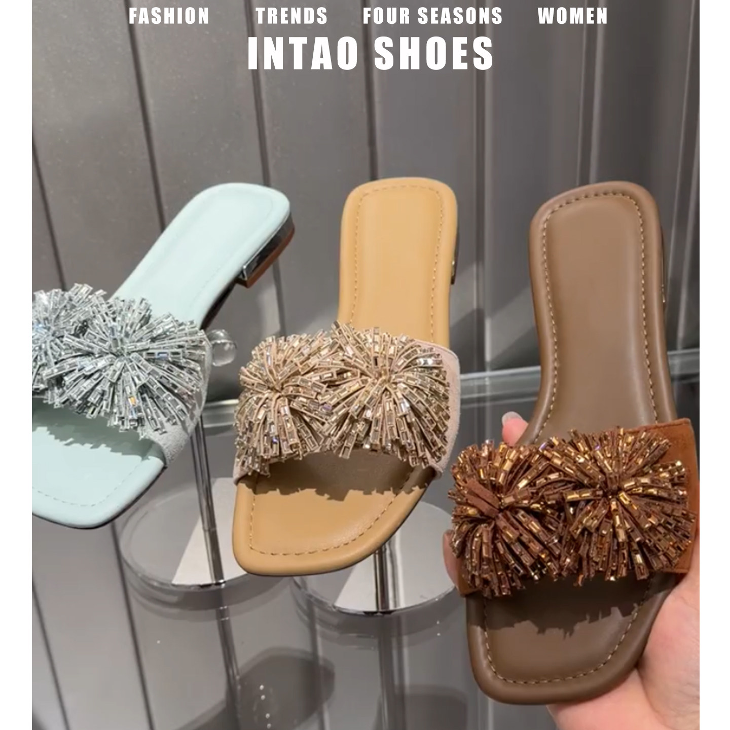 度假风烟花水钻一字拖鞋女夏外穿2026新款海边沙滩鞋露趾法式凉拖