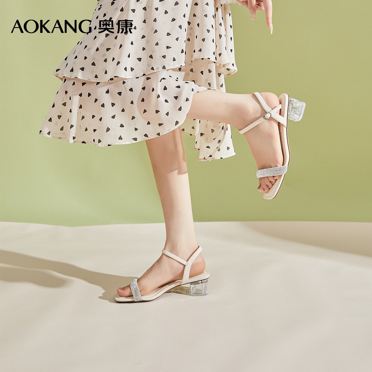 奥康 女鞋2025夏季凉鞋时尚一字带气质水钻约会水晶粗跟凉拖