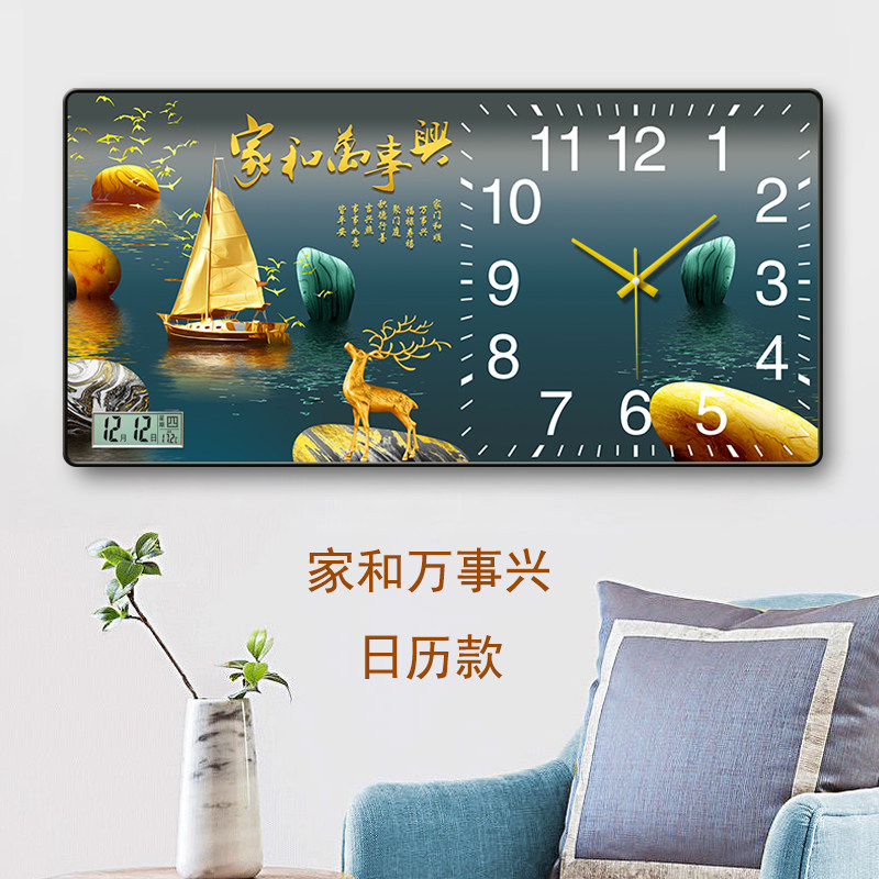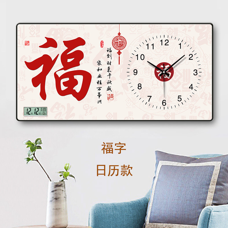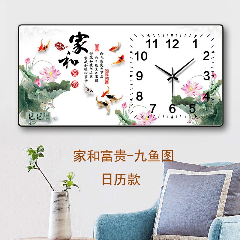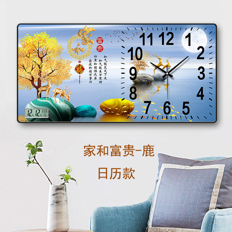 客厅墙上新款国风装饰画挂钟家用挂墙现代中式免打孔万年历石英钟
