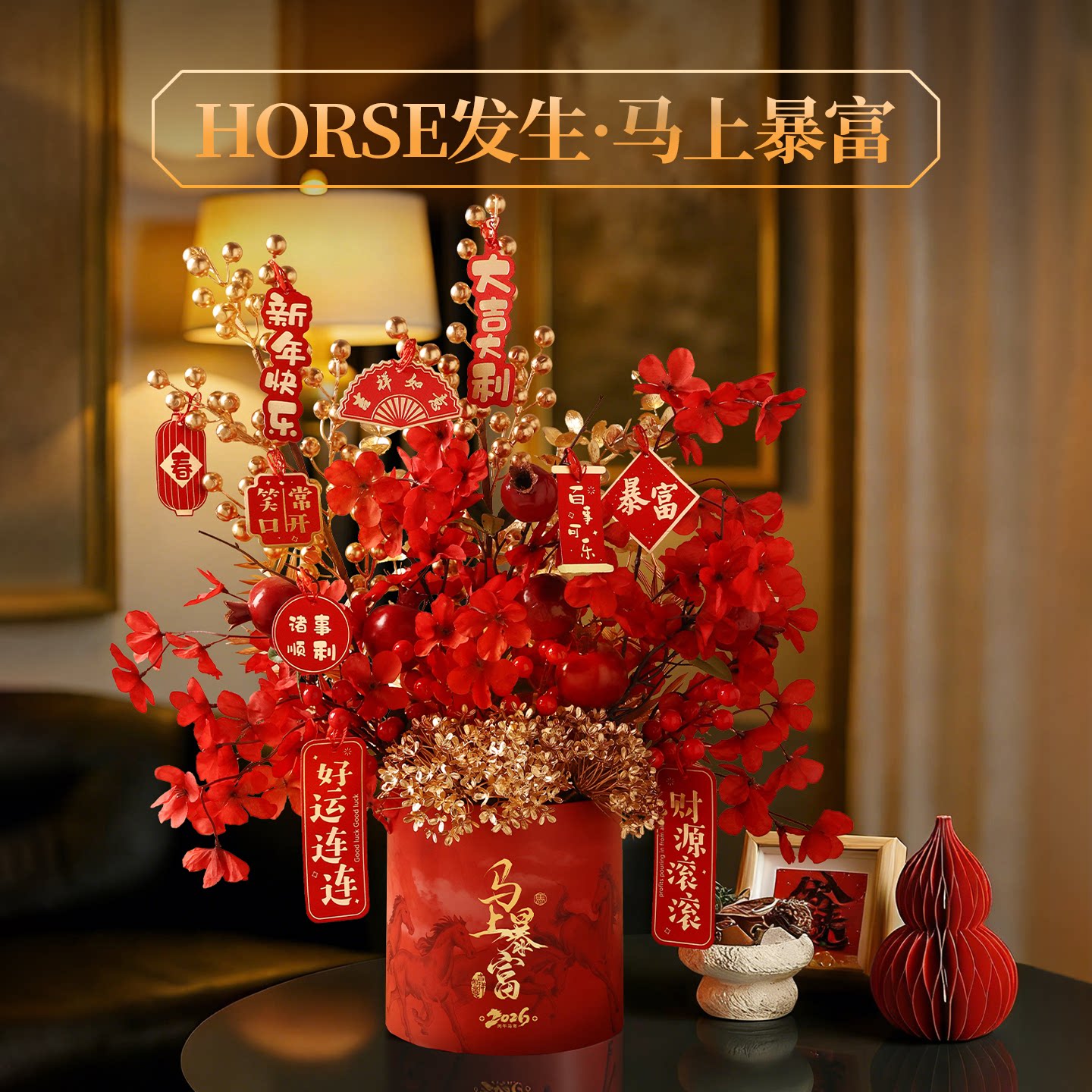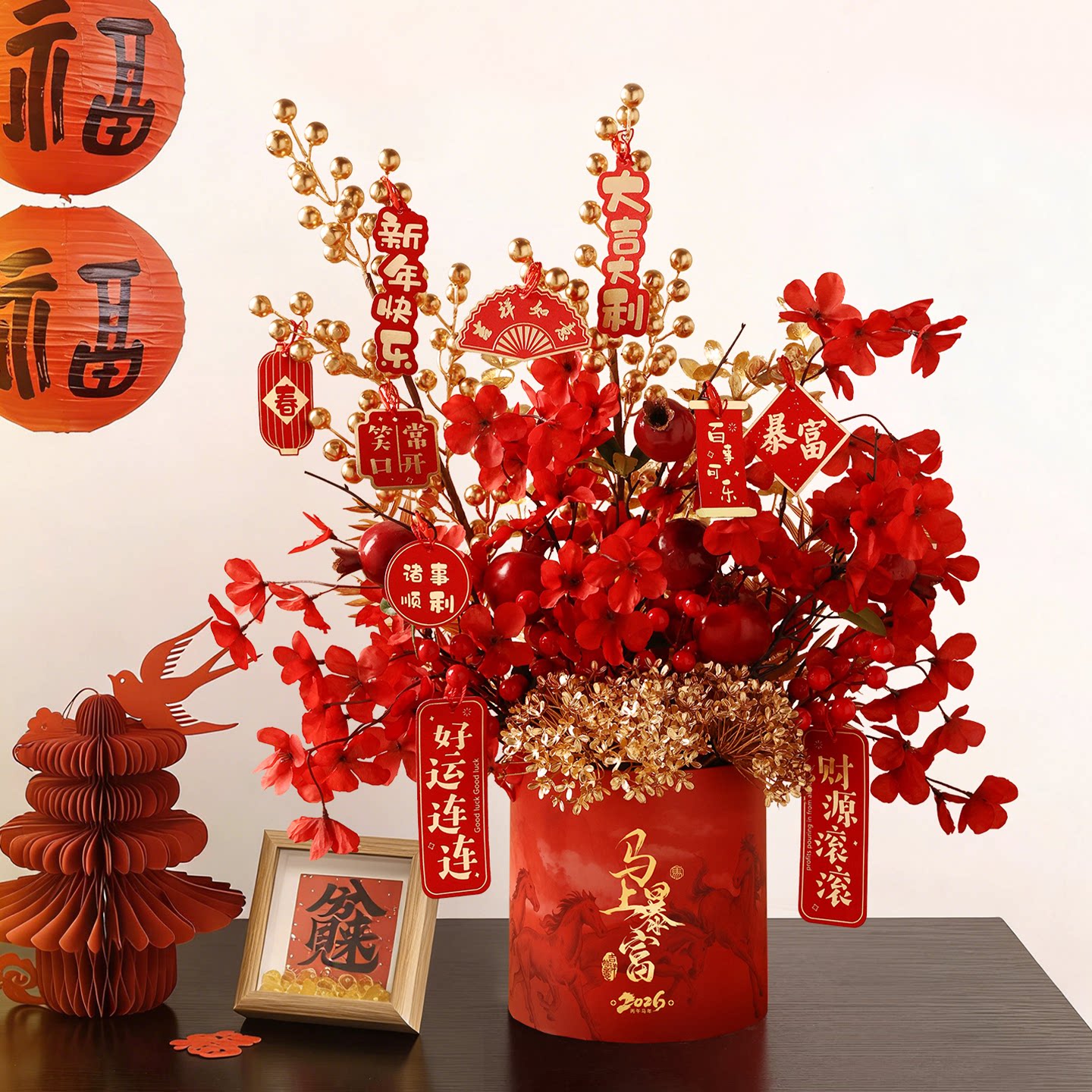 贝汉美新年抱抱桶2026马年过年摆件冬青红果年宵花桶花福桶装饰品