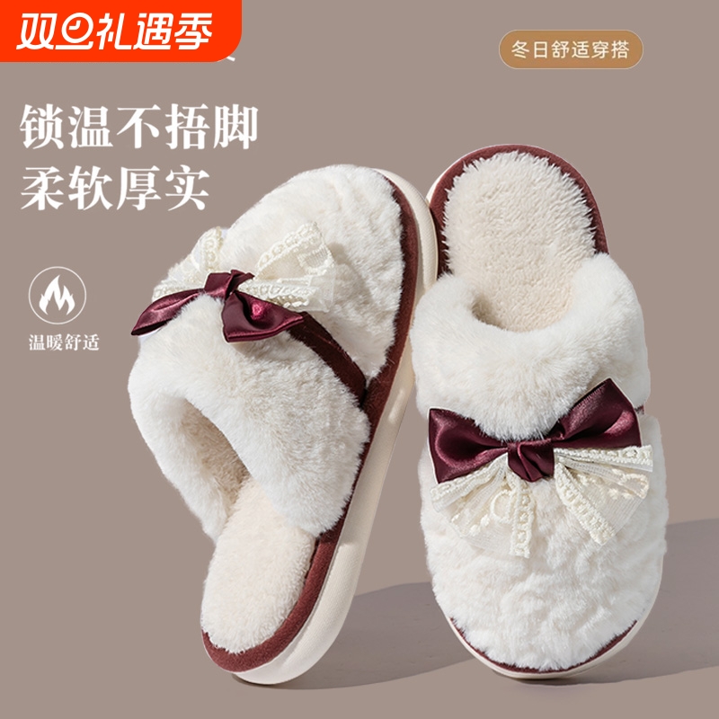 厚底棉拖鞋女居家日用保暖防滑厚底外穿时尚蝴蝶结软底舒适月子鞋